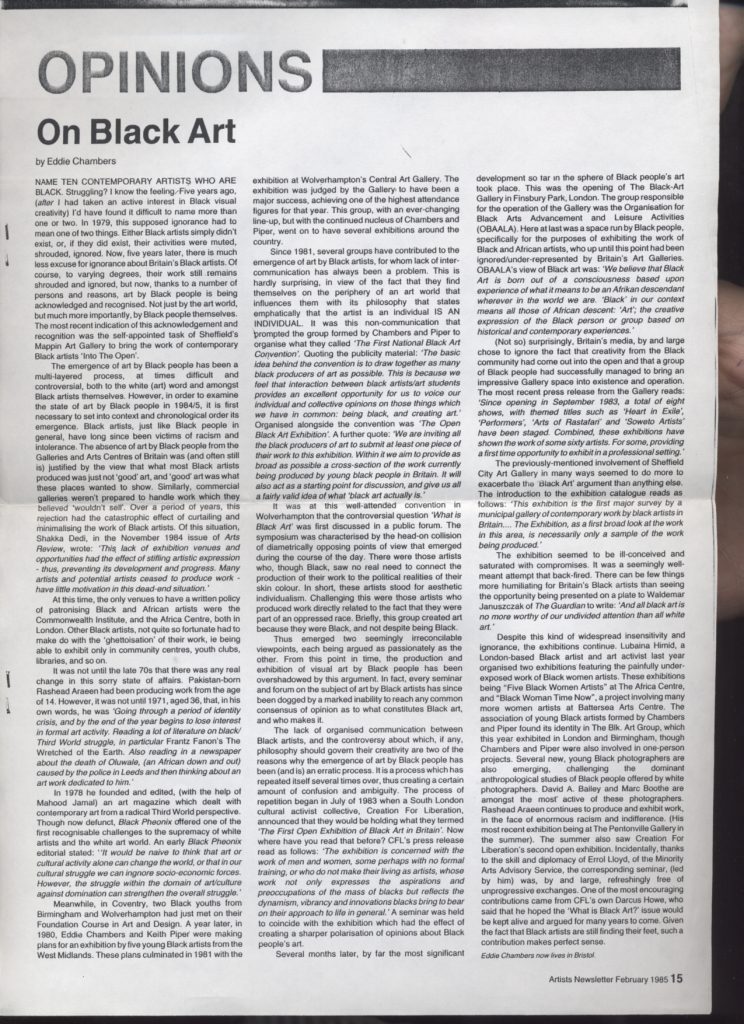 Eddie Chambers: On Black Art: Artists Newsletter 1985. Essay.